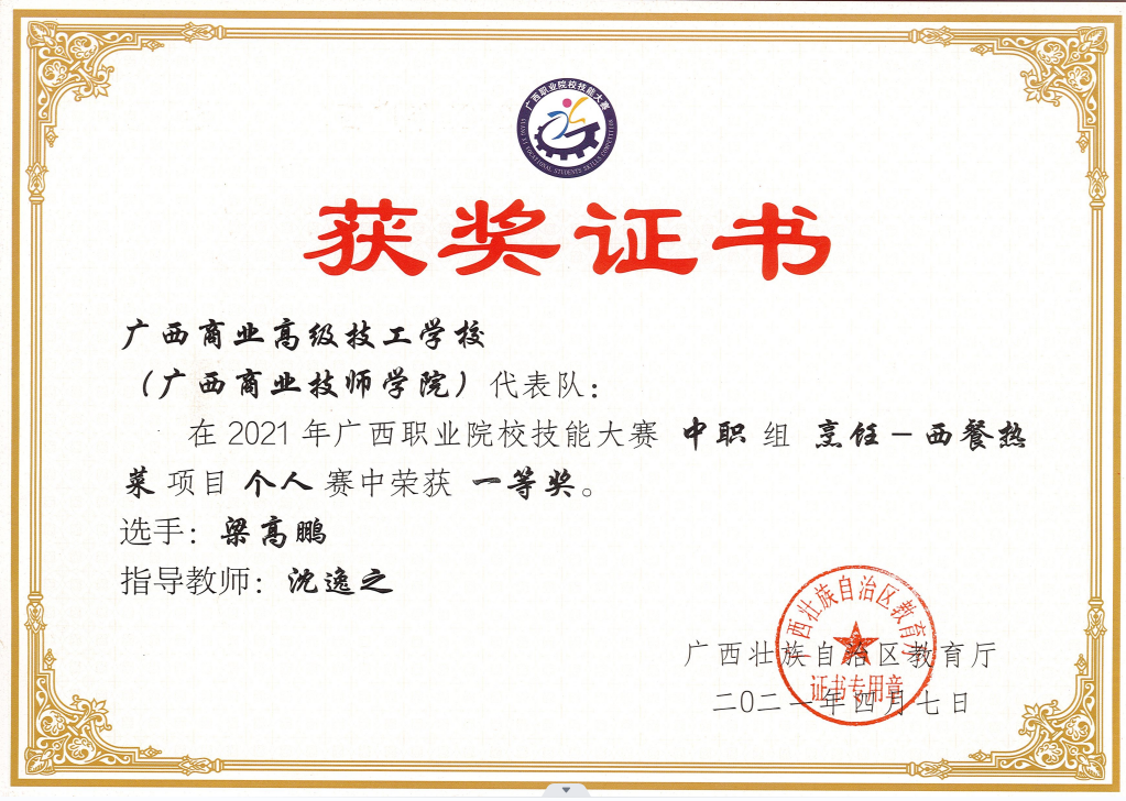 • 廣西職業院校技能大賽中餐熱菜 區級一等獎